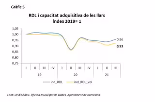 El mismo informe también recoge que la renta disponible de los hogares de Barcelona en el tercer trimestre de 2021 se mantuvo prácticamente estable (0,4%) respecto el mismo trimestre de 2020.