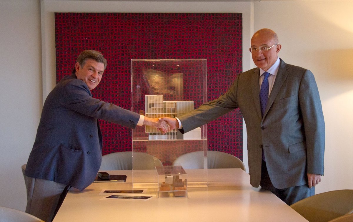 El presidente de Banco Sabadell, Josep Oliu, y el decano del Colegio de Economistas de Catalunya, Joan B. Casas, han firmado un acuerdo de mecenazgo por el que la entidad financiera participará en la financiación de la construcción de la nueva sede del colegio.