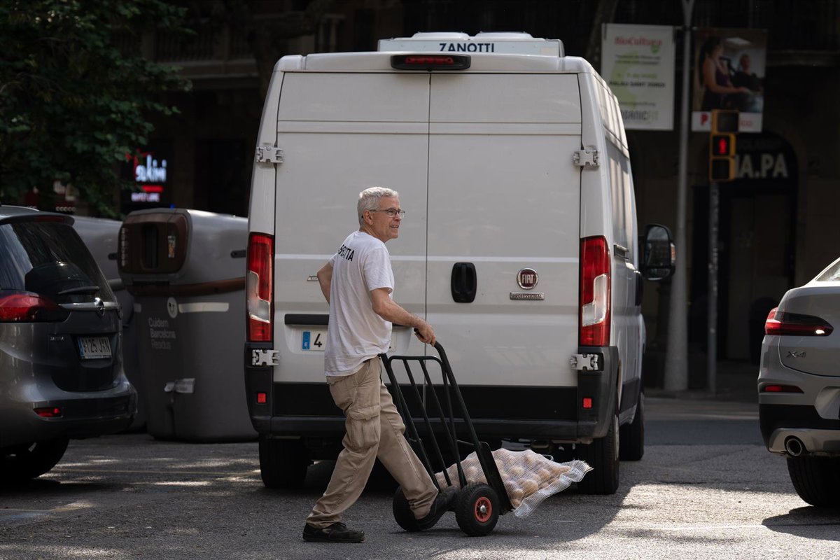Archivo - Un repartidor con una carretilla, a 10 de mayo de 2023, en Barcelona, Catalunya (España) - David Zorrakino - Europa Press - Archivo