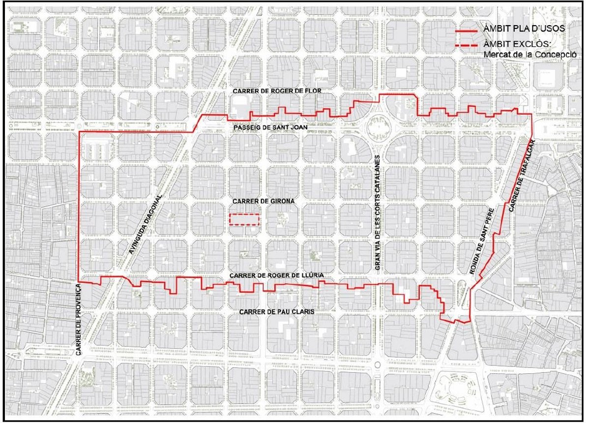 El ámbito regulado está delimitado por las calles Roger de Llúria, Córcega, el paseo de Sant Joan, la Ronda Sant Pere y la plaza Urquinaona; y contempla la transformación de la calle Girona para convertirse en uno de los primeros ejes verdes de la ciudad en el marco del programa Superilla Barcelona.