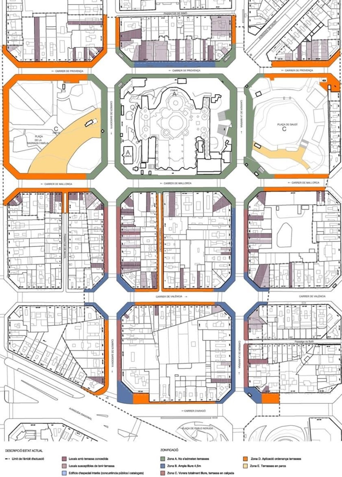 Con la aplicación de las medidas no se admitirán terrazas en las aceras de los perímetros del templo y los chaflanes de los cuatro cruces, excepto del de Sardenya con Provença, y se establece una acera libre de 4,5 metros en la ruta que componen las paradas de autocar habilitadas para visitar la basílica.
