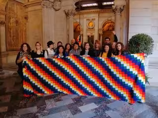 Ada Colau, Laia Bonet, Elsa Artadi, Laura Pérez y Gemma Sendra con miembros de la comunidad boliviana en Barcelona - ERC