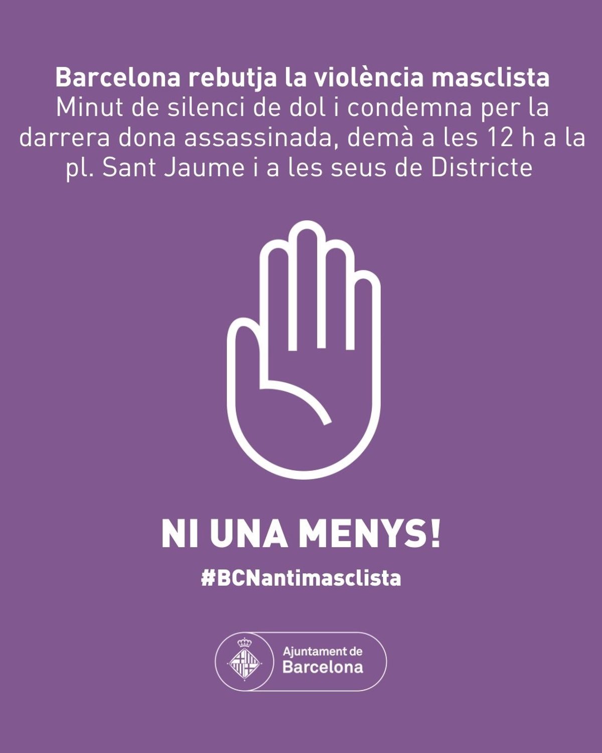 El Ayuntamiento de Barcelona ha convocado este martes un minuto de silencio para rechazar la muerte de una mujer presuntamente a manos de su expareja el 29 de diciembre en el distrito de Sant Martí de la ciudad.