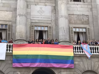 La alcaldesa de Barcelona, Ada Colau, ha presidido este jueves el acto de colocación de la bandera del Arco Iris en el balcón del Ayuntamiento de Barcelona con motivo del Día para la Liberación Sexual y de Género.