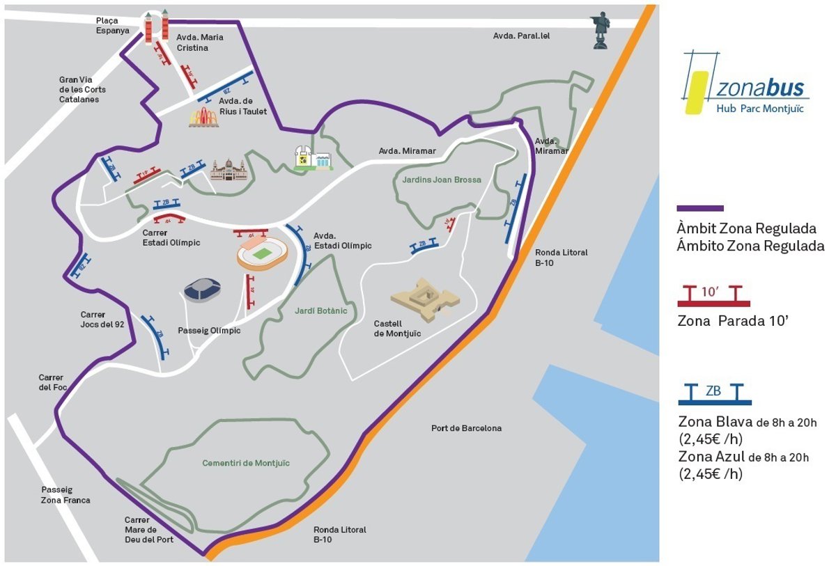 El ZonaBus Hub Montjuïc, el nuevo punto de concentración de plazas de parada y estacionamiento para los autocares turísticos que suban a la montaña de Montjuïc de Barcelona, se pondrá en marcha a partir del próximo lunes 20 de noviembre, y consta de 26 plazas de parada de 10 minutos y 89 plazas de Zona Azul-Zona Bus.