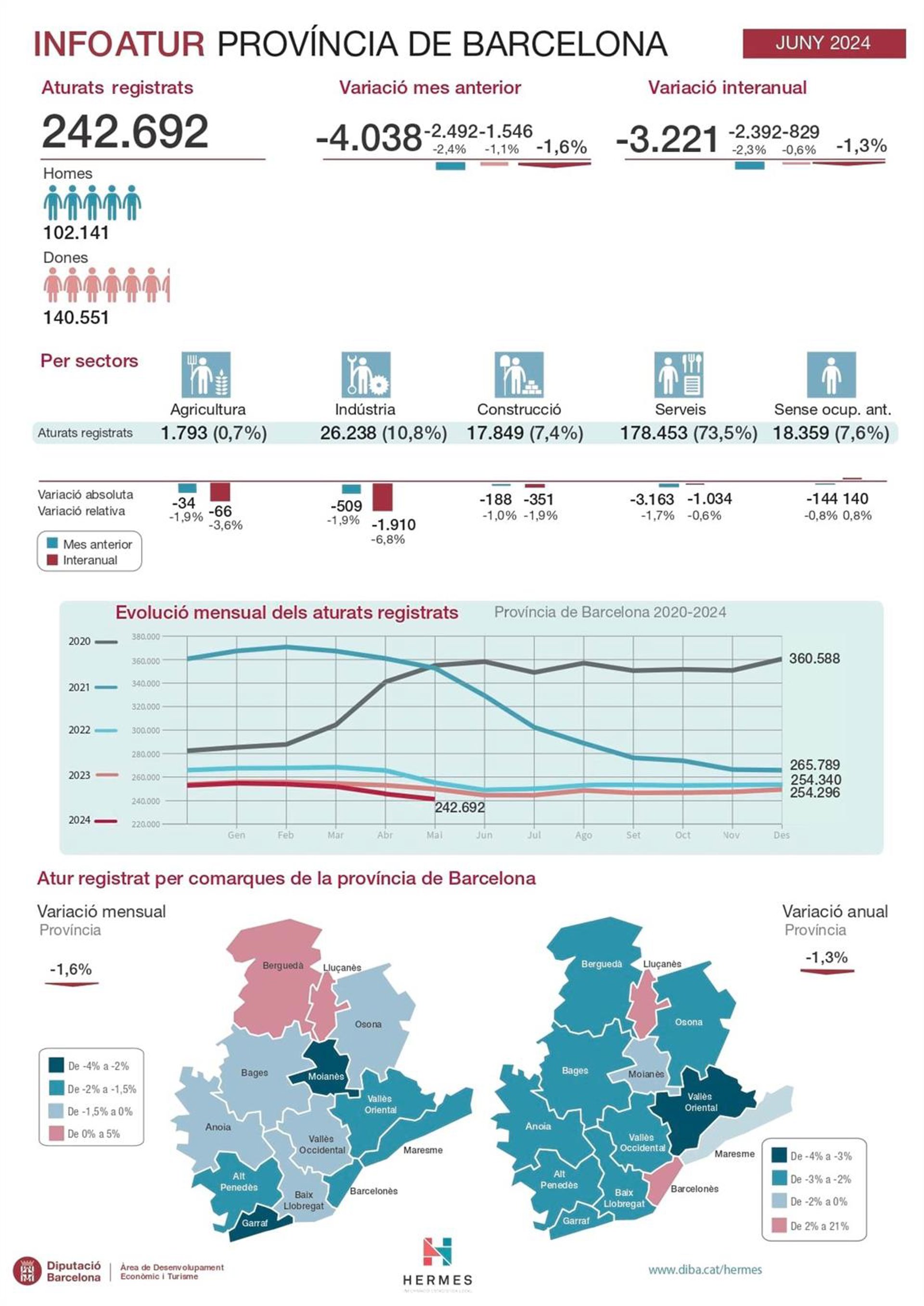 Se trata de un descenso del -1,6% respecto a mayo y del -1,3% en relación con junio del 2023, según el último informe mensual de paro registrado en la provincia, ha informado este martes la Diputación de Barcelona en un comunicado.