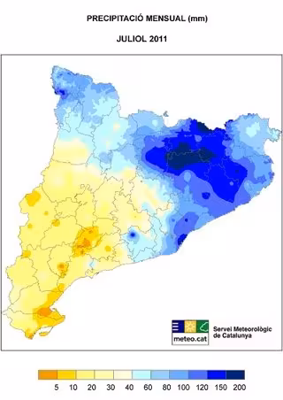 Los cinco episodios de tormentas que han cruzado Catalunya en julio han supuesto que en Perafita (Barcelona) hayan caído hasta 191,8 litros por metro cuadrado en 30 días, mientras que otras localidades como Barcelona y Girona también han registrado lluvias por encima de los 150 litros.
