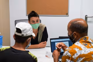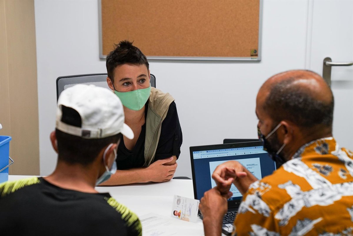 Una profesional atiende a dos personas en el nuevo centro de servicios sociales que ha abierto el Ayuntamiento en la calle Casp de Barcelona. - AYUNTAMIENTO DE BARCELONA