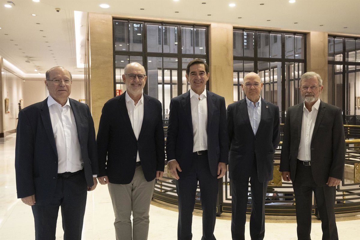 El presidente de BBVA, Carlos Torres, junto a los presidentes de las fundaciones de las antiguas cajas catalanas. - MIQUEL GONZALEZ/SHOOTING - BBVA