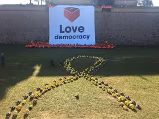 Bomberos catalanes han hecho este lunes una acción de protesta en la que han formado un gran lazo amarillo con sus cascos y han colgado una pancarta de grandes dimensiones con el mensaje 'Love Democracy' para pedir la libertad de los "presos políticos".