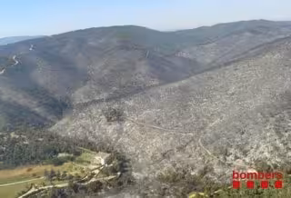 Una quincena de dotaciones terrestres y cuatro medios aéreos de los Bomberos de la Generalitat remojan la zona afectada por el incendio forestal de Vall-llobrega.