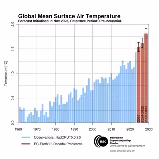 Investigadores del Barcelona Supercomputing Center-Centro Nacional de Supercomputación (BSC-CNS) han advertido de que el sistema de predicción decenal del centro prevé que la temperatura media anual de la superficie del planeta en 2024 será entre 1,43 y 1,69 grados más alta que en los niveles preindustriales, definidos como la media de la temperatura entre 1850 y 1900, con una estimación central de 1,54 grados.