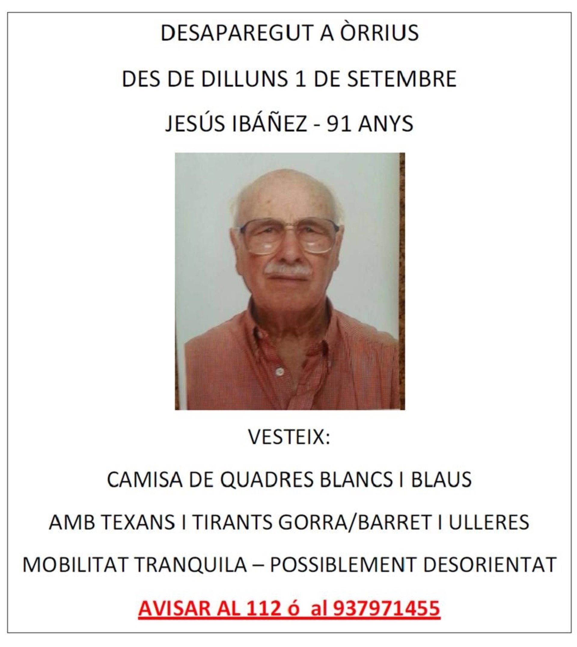 El anciano se llama Jesús Ibáñez y en el momento de su desaparición vestía camisa blanca y azul a cuadros, pantalones tejanos, una gorra y gafas.