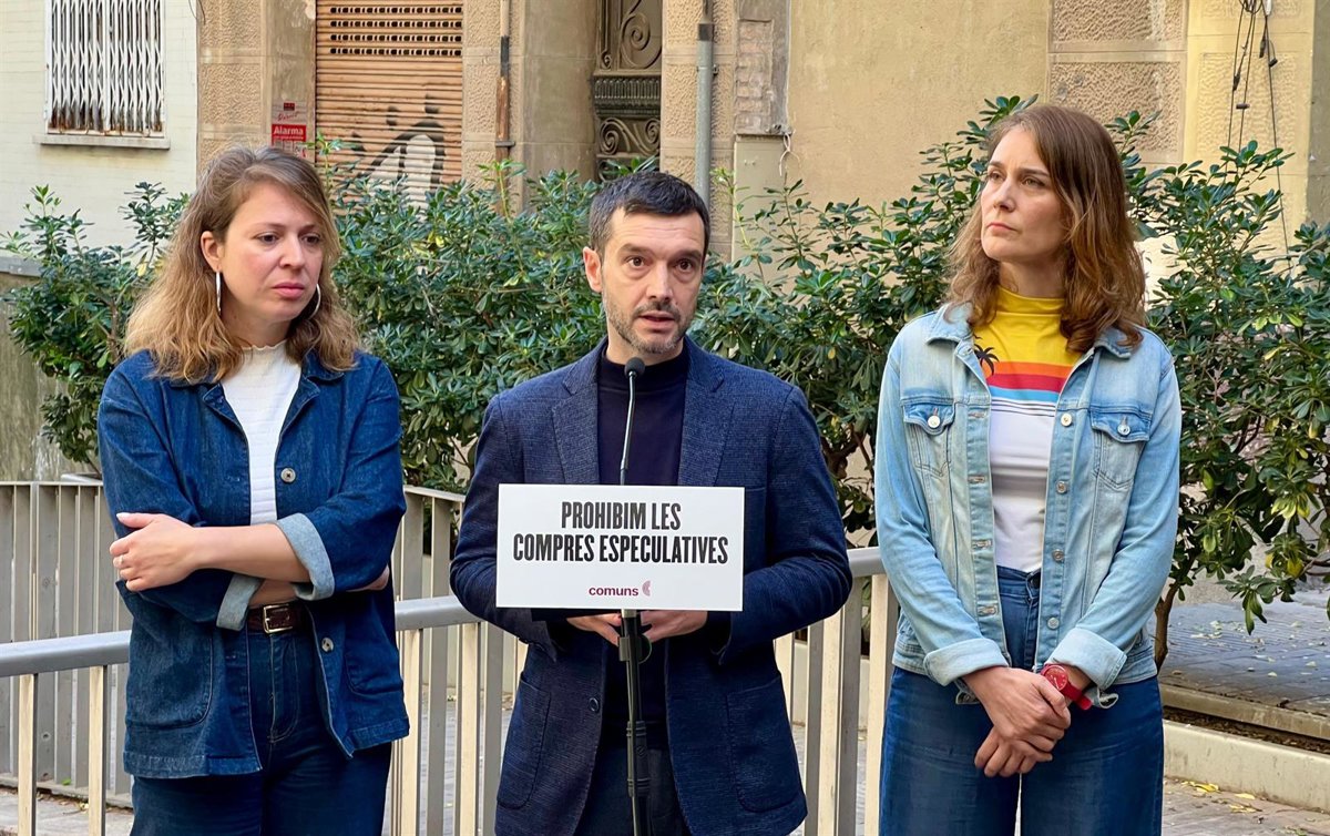 El ministro de Derechos Sociales, Consumo y Agenda 2030, Pablo Bustinduy, en una atención a los medios en Barcelona junto a la líder de los Comuns en el Parlament, Jéssica Albiach, y la líder de BComú en el Ayuntamiento de Barcelona, Janet Sanz. - EUROPA PRESS