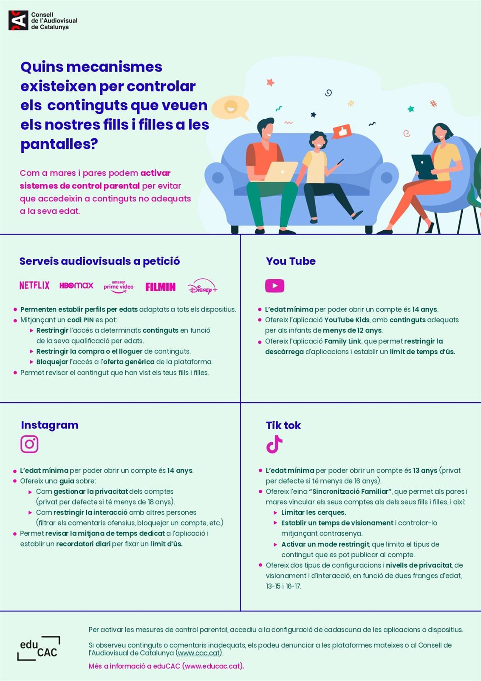 El Consell de l'Audiovisual de Catalunya (CAC), mediante el programa eduCAC, ha elaborado una guía sobre los sistemas de control parental que ofrecen las plataformas de vídeo a petición y las redes sociales, informa el organismo en un comunicado este miércoles.