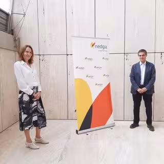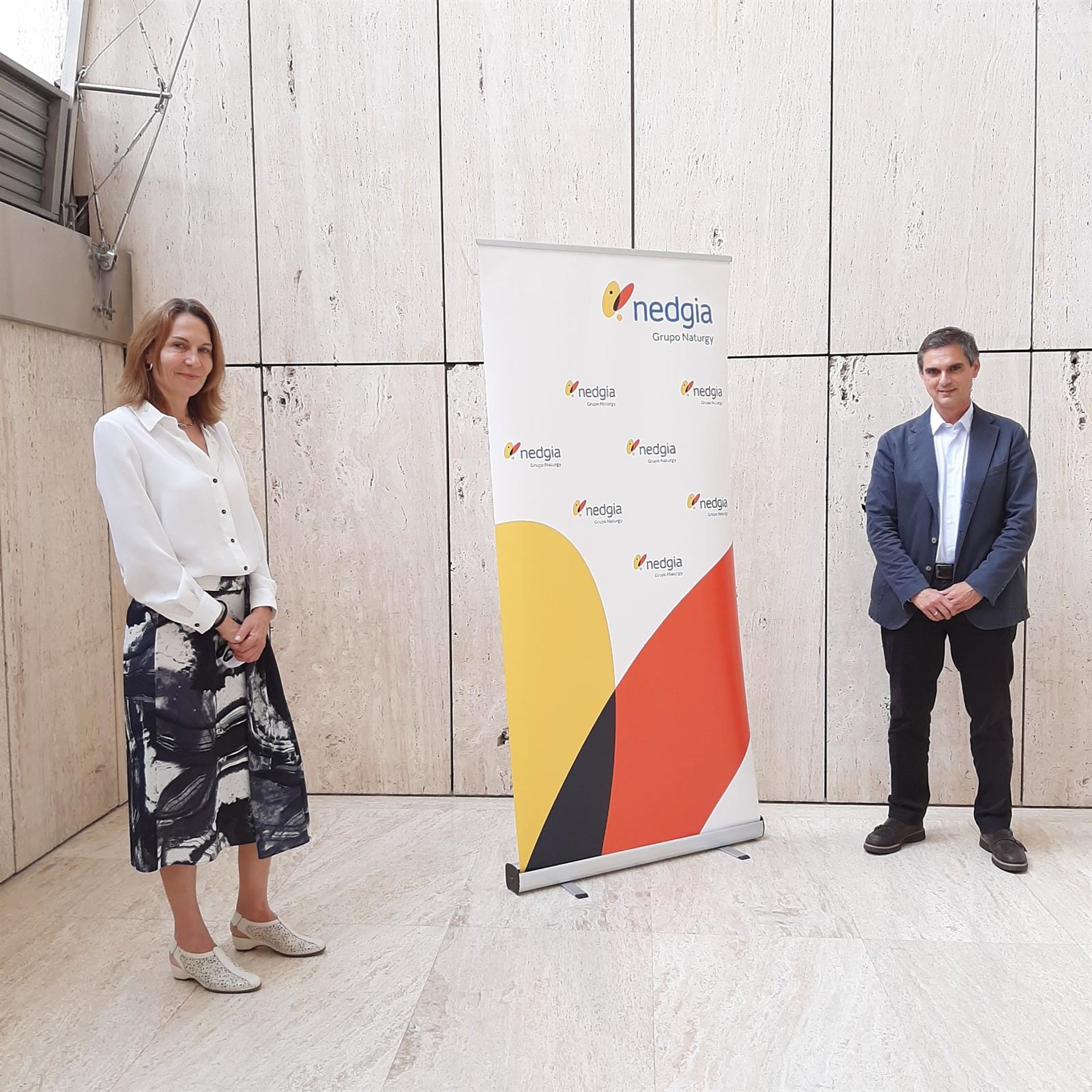 El director de Acuerdos Estratégicos de CaixaBank Payments & Consumer, Igor Sanchez, y la directora de Estrategia Comercial y Transformación de Nedgia, Elena Longarela, en el acto de la firma del convenio. - NEDGIA