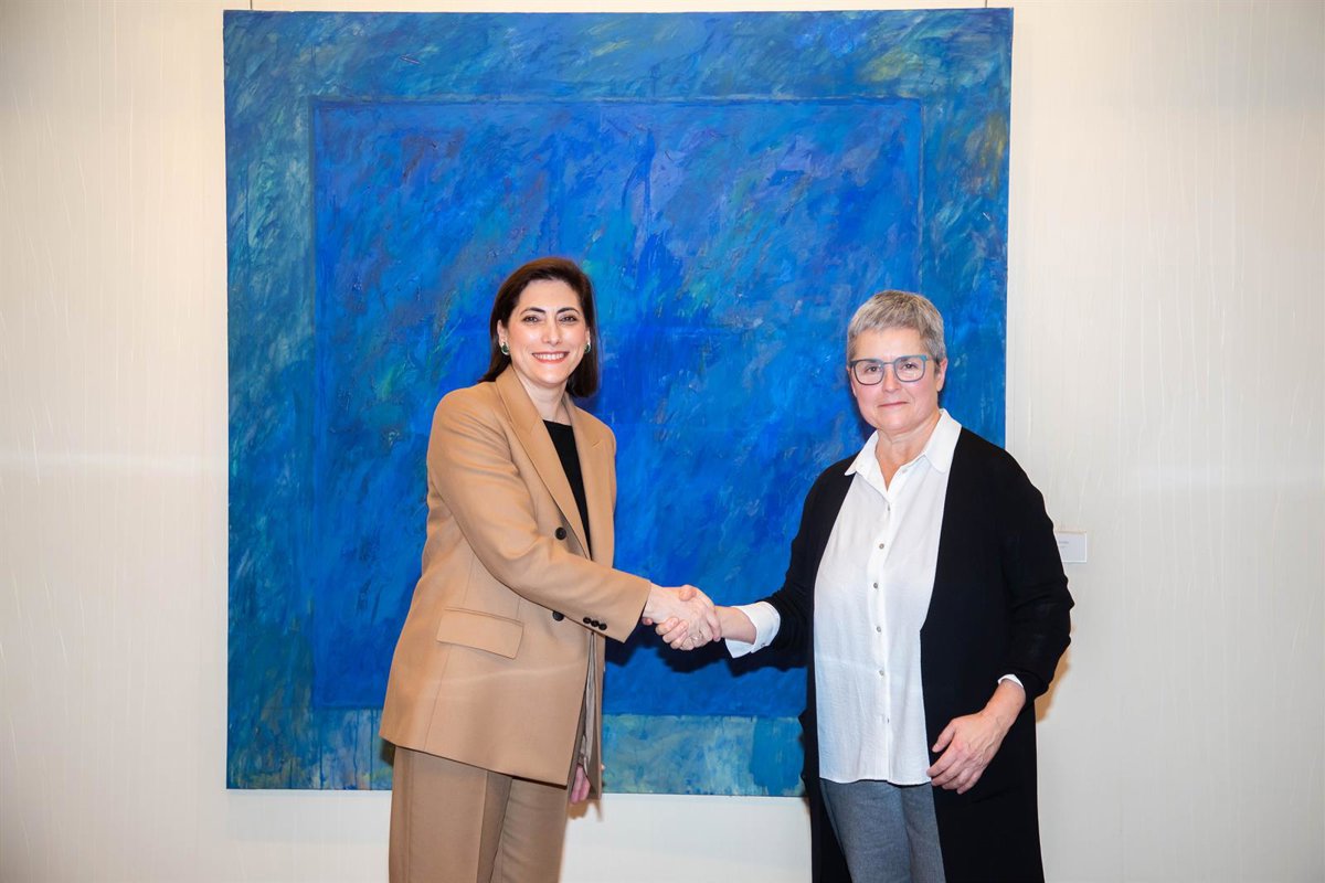 La directora de Comunicación y Relaciones Institucionales de CaixaBank, María Luisa Martínez Gistau, y la directora de la Feria del Libro de Madrid, Eva Orúe, en la firma del acuerdo - MAXIMO GARCIA DE LA PAZ