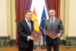 El ministro de Agricultura, Pesca y Alimentación, Luis Planas, y el director general de Negocio de CaixaBank, Juan Antonio Alcaraz, han participado en el acto protocolario de la prórroga del convenio entre ambas instituciones para mejorar la competitividad del sector.