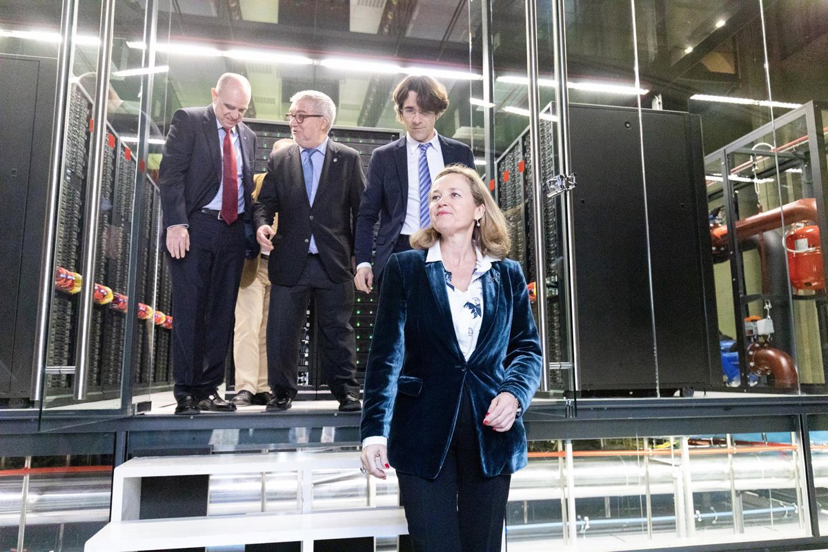 El secretario de universidades de la Generalitat, Francesc Xavier Grau; el director del Barcelona Supercomputing Center, Mateo Valero; el director social Josep Maria Martorell y la ministra de Economía en funciones, Nadia Calviño, en Barcelona - Pau Venteo - Europa Press