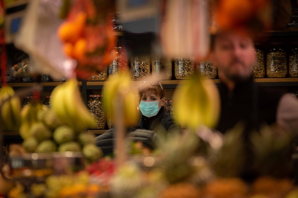 Una mujer protegida con mascarilla espera a ser atendida en una frutería durante el segundo día laborable del estado de alarma por el coronavirus, en Barcelona (España), a 17 de marzo de 2020. - David Zorrakino - Europa Press
