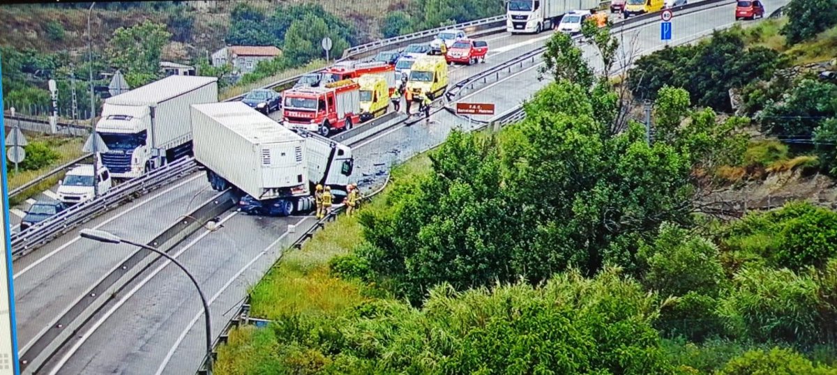 Los Bomberos de la Generalitat han activado tres dotaciones y han hecho contención de una fuga de gasóleo del camión frigorífico, que circulaba sin carga, y los Mossos d'Esquadra han activado seis patrullas para gestionar la incidencia.