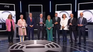 Los candidatos a la alcaldía de Barcelona Eva Parera (Valents), Anna Grau (Cs), Jaume Collboni (PSC), Ernest Maragall (ERC), Ada Colau (BComú), Xavier Trias (Junts) y Daniel Sirera (PP) participan en el debate electoral de RTVE Catalunya. - @RTVENOTICIES