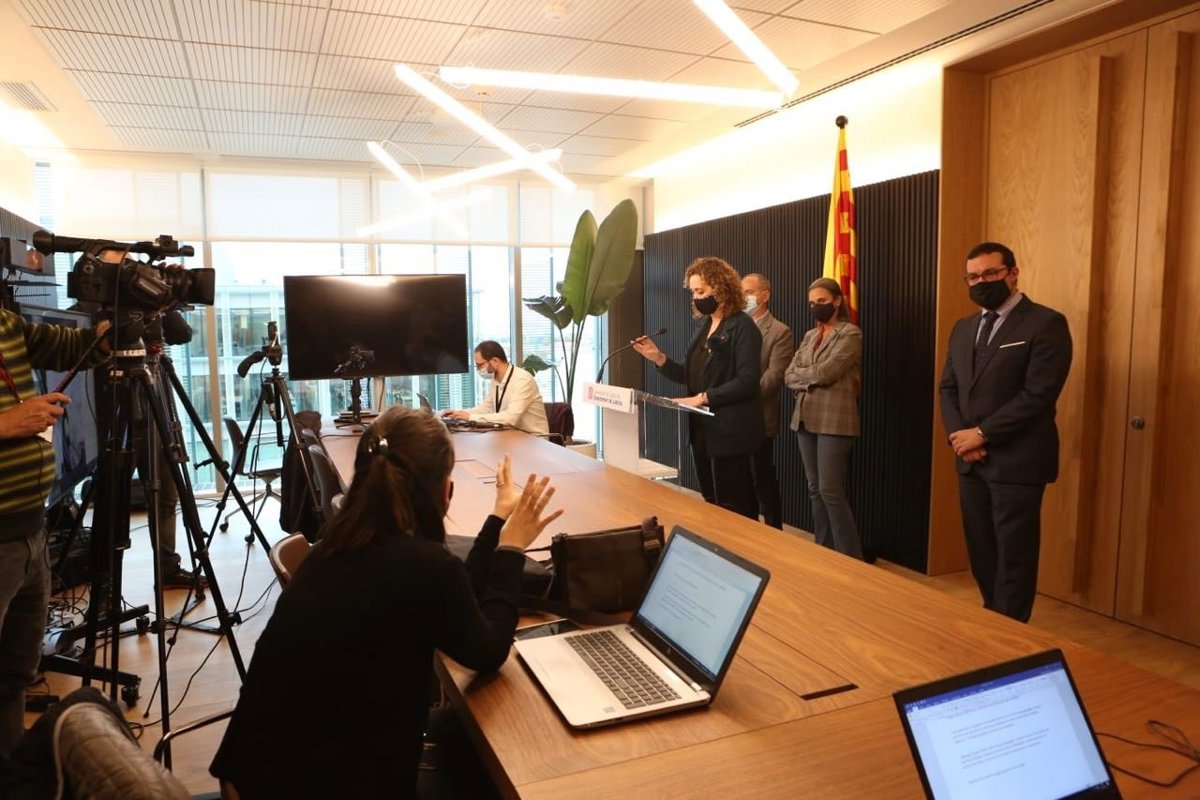 La consellera de Justicia Ester Capella, en rueda de prensa junto al secretario del Colegio de la Abogacía de Barcelona (Icab) Jesús Sánchez y la consejera del Consell de la Advocacia Catalana (Cicac) Eva Maria Ribó. Barcelona 3 de noviembre de 2020. - CONSELLERIA DE JUSTICIA