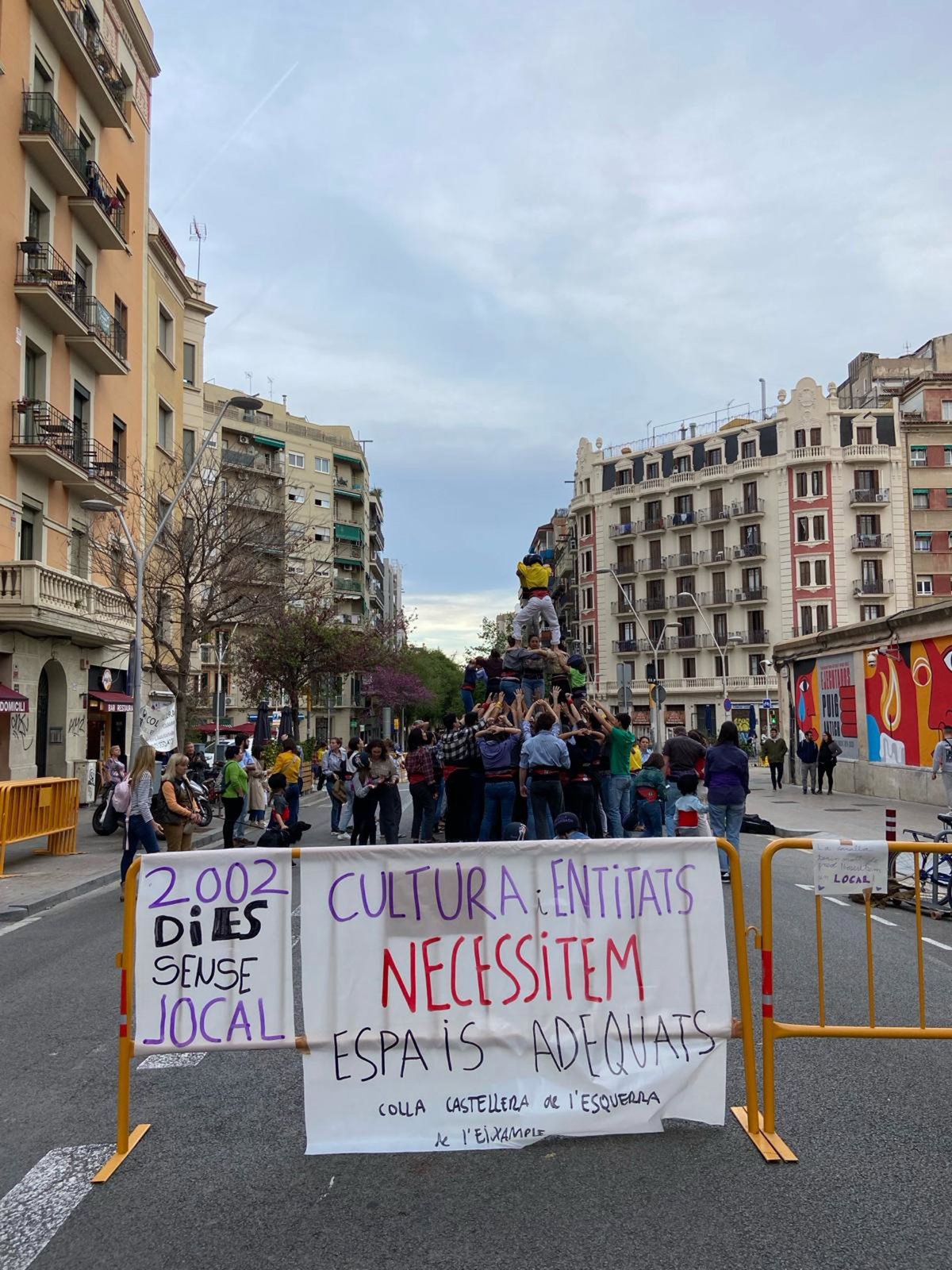 Unos 120 'castellers' han ocupado la calle desde las 19 hasta las 21.30 horas, su hora de ensayo, y han hecho 'castells' rodeados de pancartas que reclamaban que el Ayuntamiento de Barcelona les proporcione un local de ensayo, informa la 'colla' en un comunicado.
