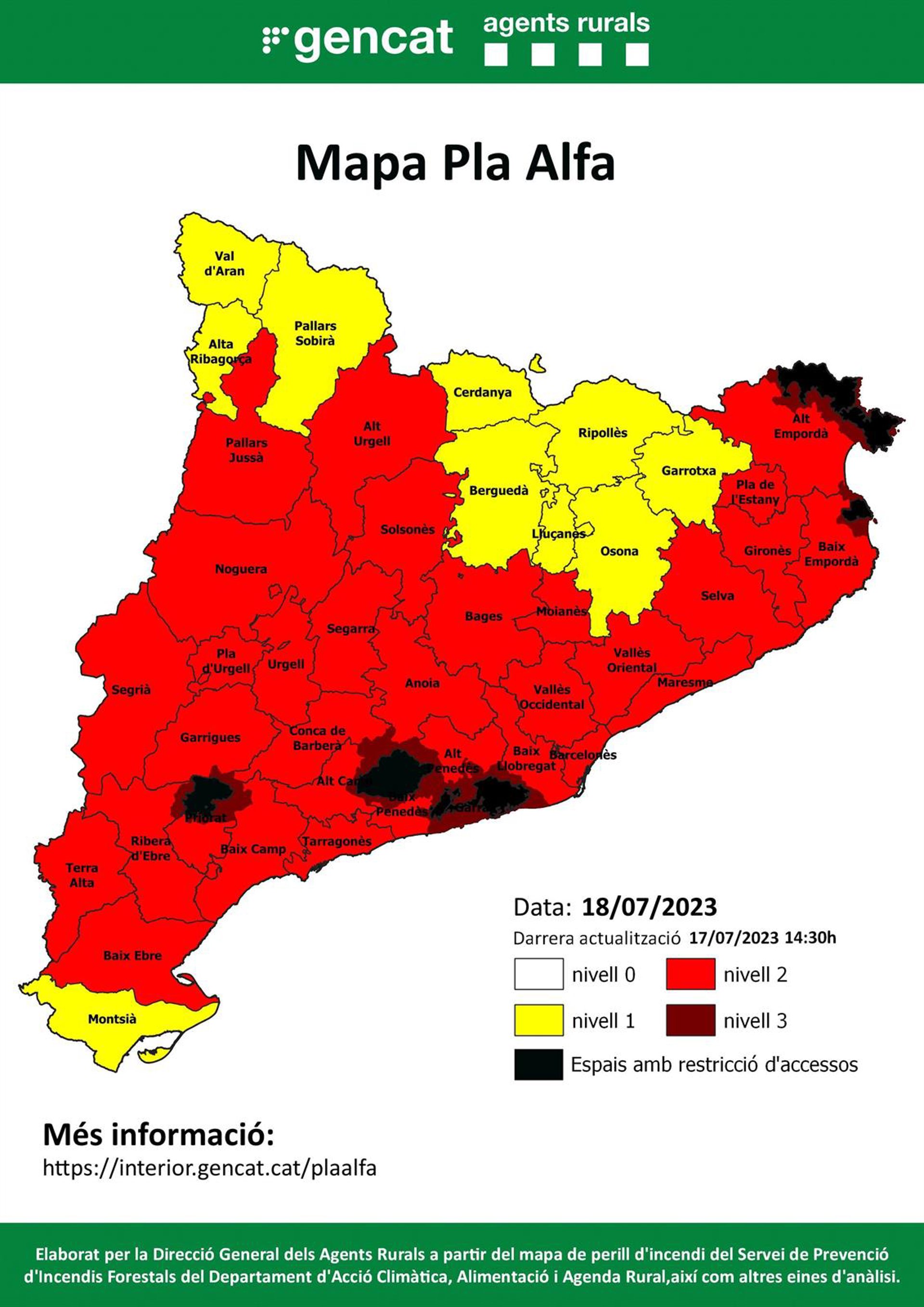 Los Agents Rurals de Catalunya activarán el nivel 3 del Pla Alfa en 57 municipios catalanes de 8 comarcas este martes a medianoche y restringirán los accesos a 6 espacios naturales protegidos, por el "elevado peligro de incendio forestal".