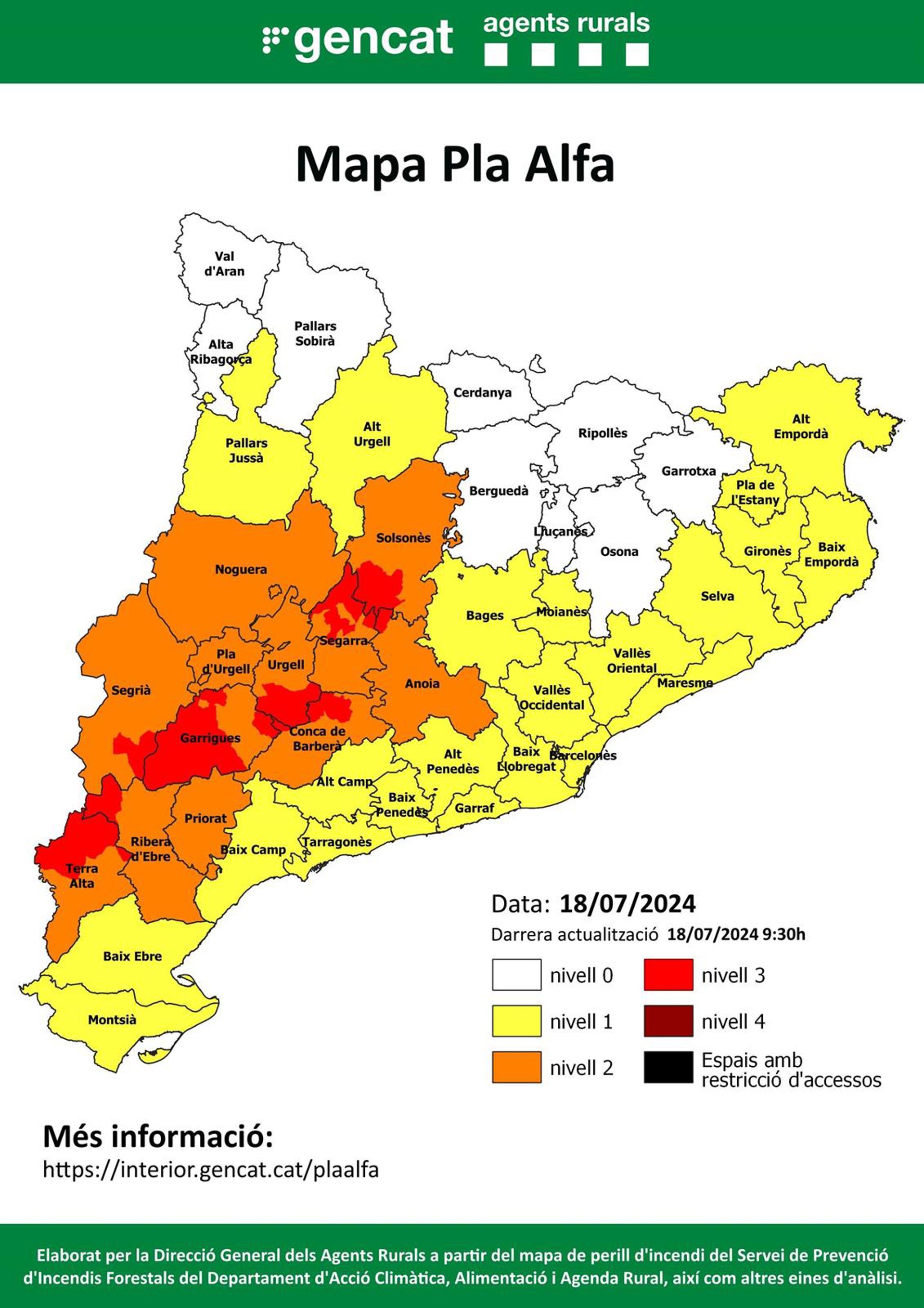 Los Agents Rurals de Catalunya han activado este jueves el nivel 3 del Plan Alfa por riesgo de incendio en 41 municipios catalanes de 9 comarcas y han restringido los accesos a 6 espacios naturales protegidos, por el "elevado peligro de incendio forestal".