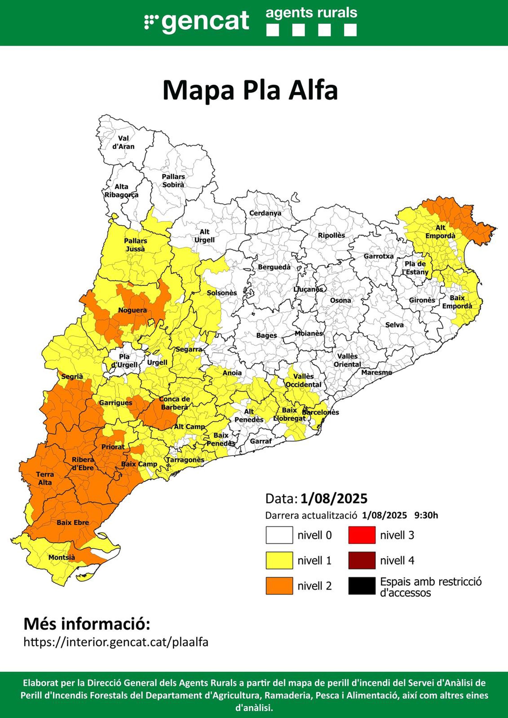 Los Agents Rurals han desactivado el nivel 3 del Pla Alfa por peligro muy alto de incendio forestal en toda Catalunya este viernes por la mañana.