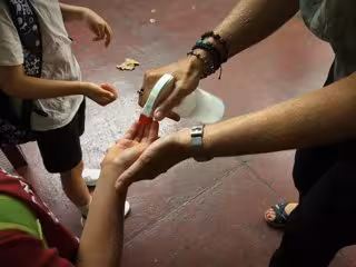 Una maestra dispensando gel hidroalcohólico a unos alumnos en el primer día del curso 2021-2022 en el Institut Escola Londres de Barcelona - EUROPA PRESS