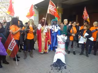 Una cincuentena de trabajadores han protestado ante la sede de Dirección General de Relaciones Laborales de la Generalitat, en la calle Sepúlveda de Barcelona, en la que tres personas se han disfrazado de Reyes Magos, portando carbón para criticar la situación "denigrante" en geriátricos con dinero público.