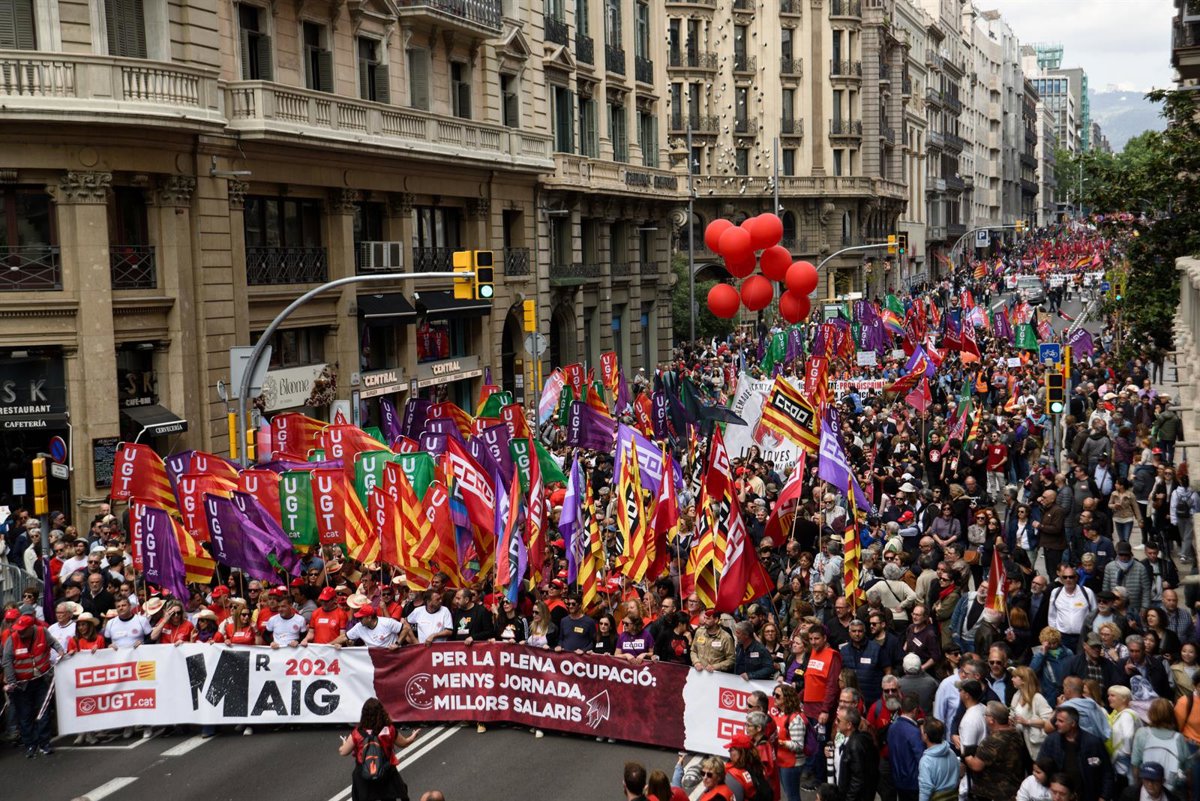 Los sindicatos CC.OO. y UGT de Catalunya se manifestarán este 1 de mayo para reivindicar que se cumpla el acuerdo para rebajar la jornada laboral hasta las 37,5 horas en 2025 y para rechazar las políticas del presidente estadounidense, Donald Trump.