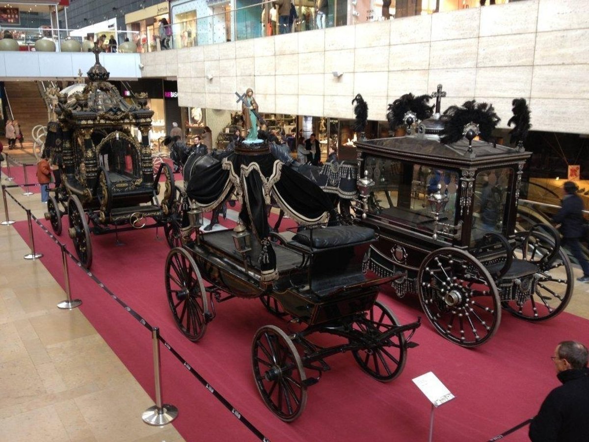Cementerios de Barcelona ha presentado este lunes en el centro comercial Illa Diagonal la exposición 'Historia del último viaje', una muestra que recoge cinco modelos diferentes de carrozas fúnebres, la colección de este tipo más importante de Europa.