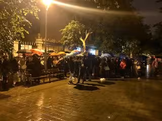 Paraguas en mano por la lluvia que cae desde esta madrugada, las personas concentradas esperan pacíficamente delante de la entrada de la calle Còrsega de Barcelona, y hasta hay voluntarios que han ofrecido cafés a los presentes.