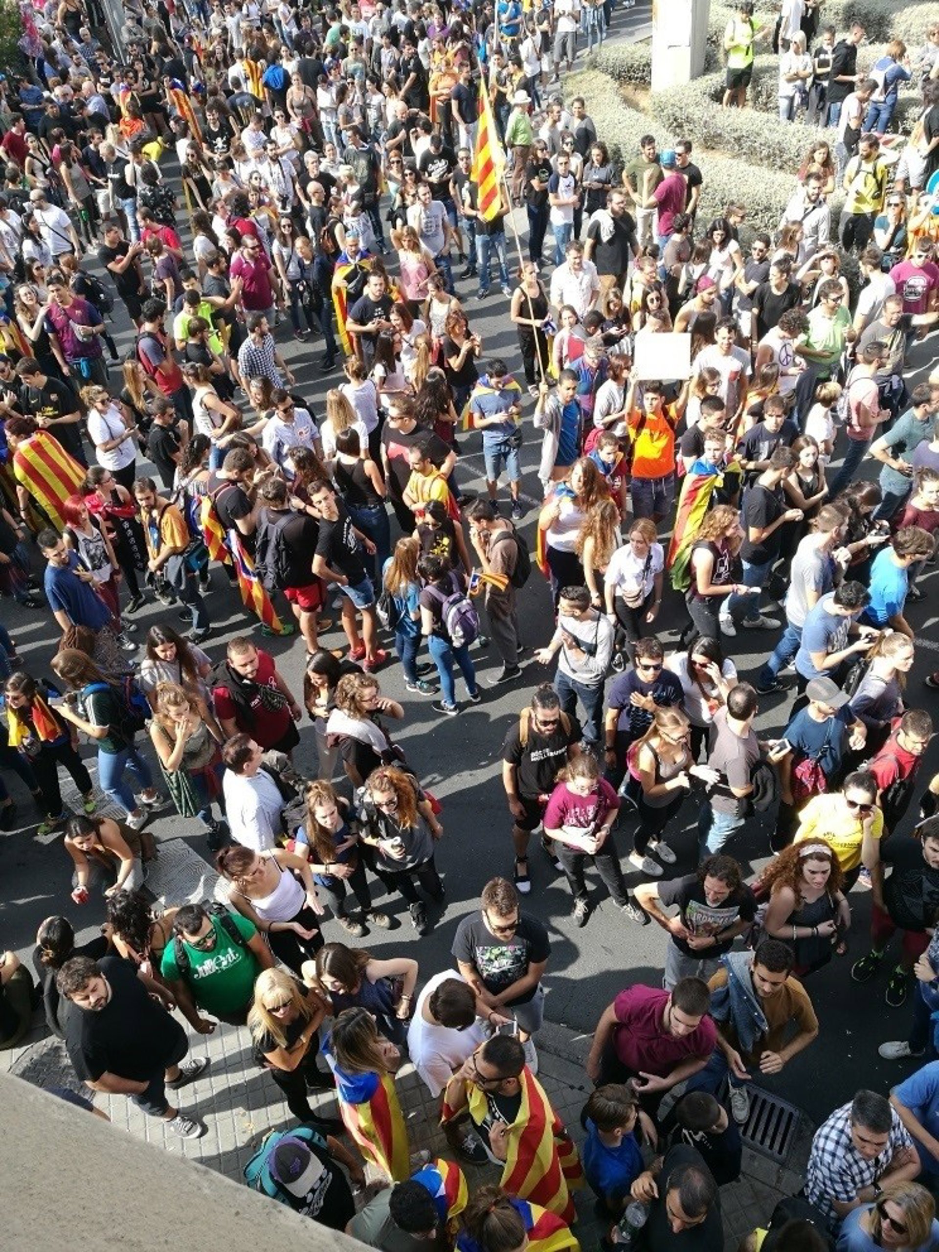 Centenares de leridanos se han concentrado este martes en el cruce de las calles Prat de la Riba y l'Ensenyança de Lleida, junto a la comisaría de la Policía Nacional con gritos de independencia.