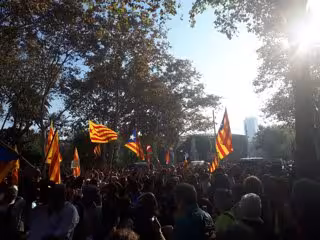 Los concentrados llevan carteles y gritan por la liberación de los presidentes de la ANC y de Òmnium, Jordi Sànchez y Jordi Cuixart, y contra la aplicación del artículo 155 y banderas --la mayoría 'estelades'--, y han aplaudido el paso de alcaldes, vara en mano, camino del Parlament.