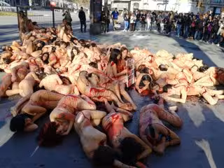 'No te pongas su piel, ponte en su piel', '¿Cuántas vidas por un abrigo?' o 'Ellos necesitan su piel, tu no' han sido algunos de los mensajes que los activistas han lanzado a la población desnudos, cubiertos de sangre artificial y amontonados los unos con los otros para representar la situación que viven los animales víctimas de la industria peletera.