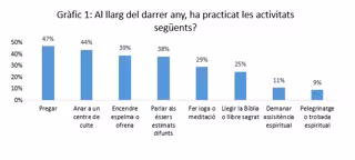 Las prácticas menos habituales entre los catalanes son leer libros sagrados (25%), pedir asistencia espiritual (11%) o participar en peregrinajes o encuentros espirituales (9%), a menudo vinculadas a determinadas creencias.