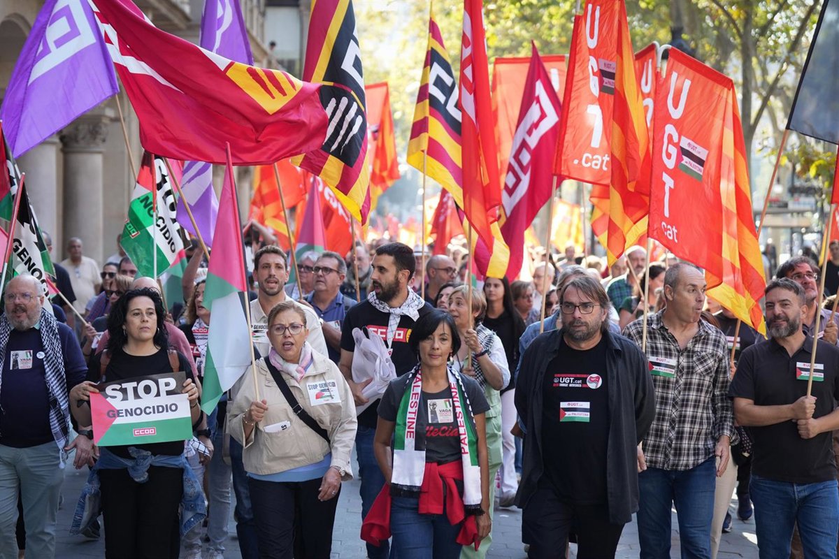 La secretaria general de CCOO en Catalunya, Belén López (c), y el secretario general de UGT de Catalunya, Camil Ros (3d), durante una manifestación a favor de Palestina, a 15 de octubre de 2025, en Barcelona, Catalunya (España). Hoy está convocada una hue - David Zorrakino - Europa Press