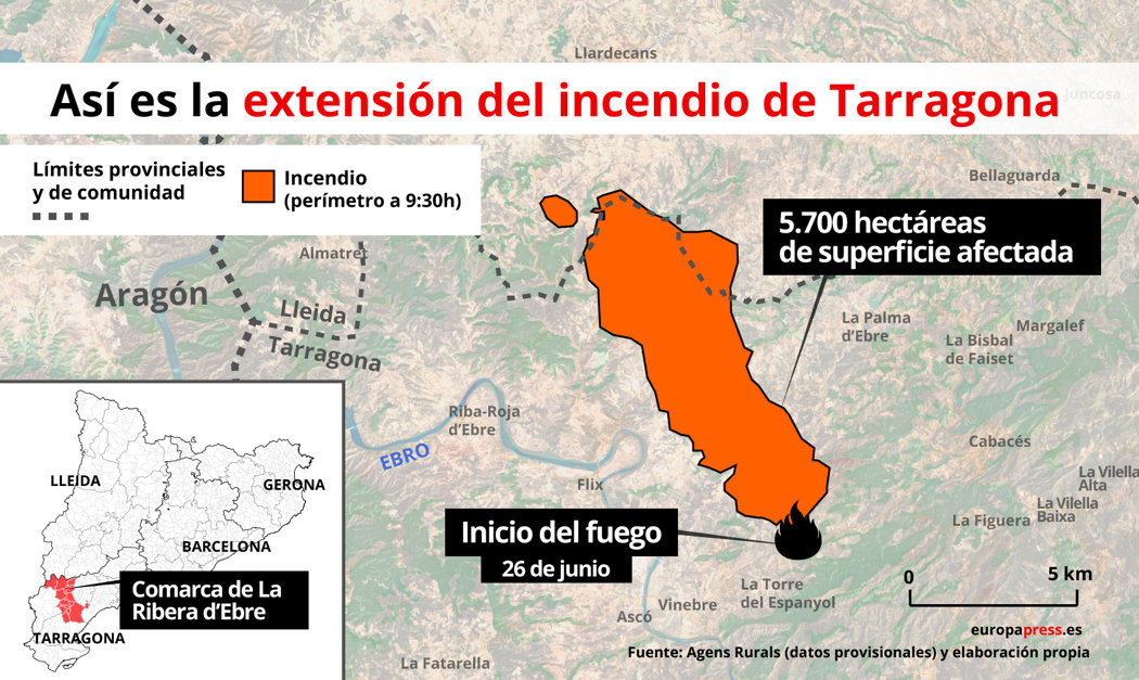 Los Agentes Rurales han calculado la afectación del incendio en La Ribera d'Ebre (Tarragona) y lo sitúan en un perímetro de 5.700 hectáreas y no de 6.500 como se dijo este jueves, según datos de un portavoz del Cuerpo, Joan Rius.