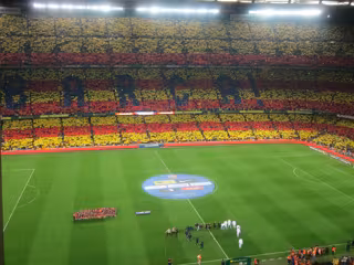 Antes del inicio del encuentro, la afición ya ha cantado a favor de la independencia y el estadio blaugrana se ha engalanado con un mosaico gigante formado por 98.000 cartulinas con los colores de la 'senyera' y la palabra 'Barça!' como protagonistas, que ha lucido cuando los jugadores han saltado al campo y mientras sonaba el himno del Barça por megafonía; además, se ha visto una pancarta con el lema 'Catalonia next European state'.