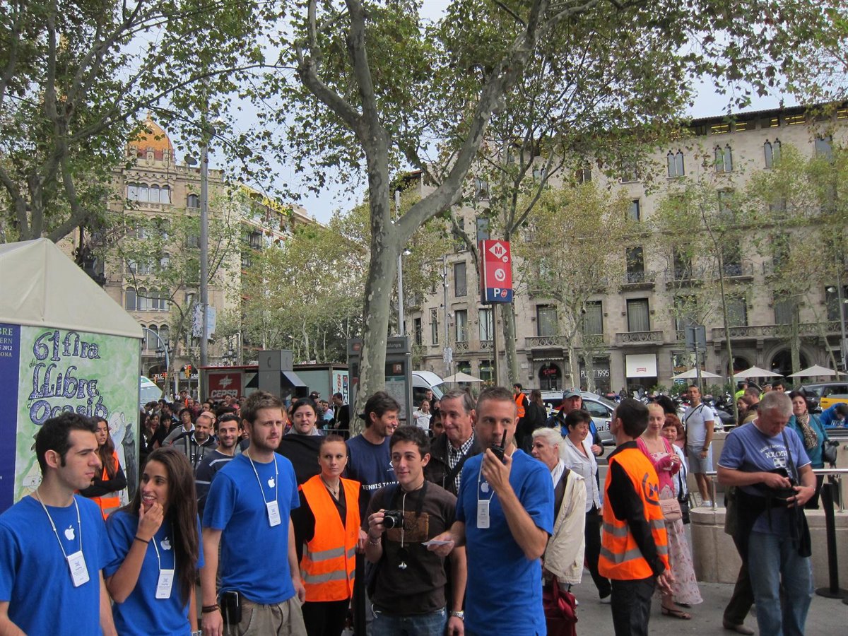 Trabajadores de la Apple Store catalana reciben a los clientes en la puerta con aplausos y vítores, y algunos de ellos han indicado que si han querido comprar el móvil el primer día era por temor a que durante la tarde de este viernes ya no quedaran existencias.