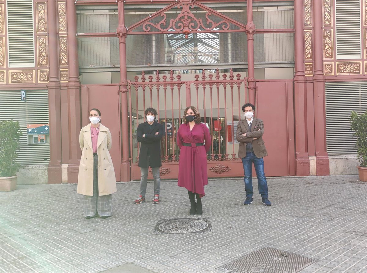 La alcaldesa de Barcelona, Ada Colau, junto con los presentadores del programa 'Masterchef', los restauradores Samantha Vallejo-Nájera, Pepe Rodríguez y Jordi Cruz, en un rodaje en el Mercat de Sant Antoni. - EUROPA PRESS