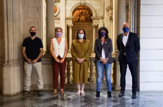 El concejal Eloi Badia; la teniente de alcalde Janet Sanz; la alcaldesa de Barcelona, Ada Colau, y la consellera Teresa Jord. - AJUNTAMENT DE BARCELONA