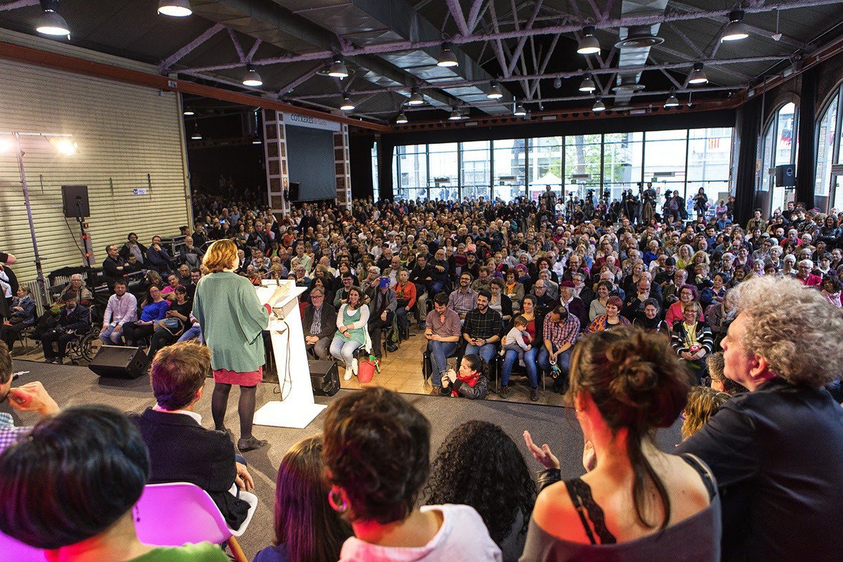 La alcaldesa de Barcelona, Ada Colau, ha pedido a ERC y PSC "dejen de pensar en la batalla partidista y que empiecen a pensar con altura de miras, en hacer políticas de izquierdas, sociales y comunes que son más necesarias que nunca", en el acto 'Guanyarem amb tu' este domingo en las Cotxeres de Sants.