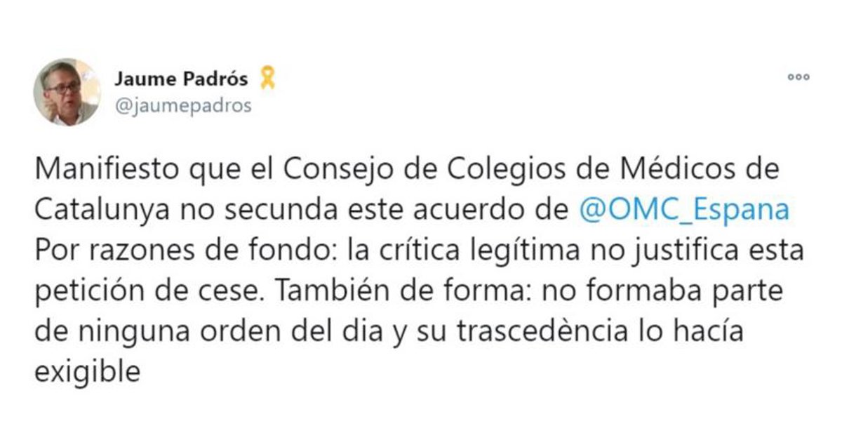El presidente del colegio barcelonés y del CCMC, Jaume Padrós, ha dicho, en un tuit recogido por Europa Press, que no lo secundan por razones de forma y de fondo.