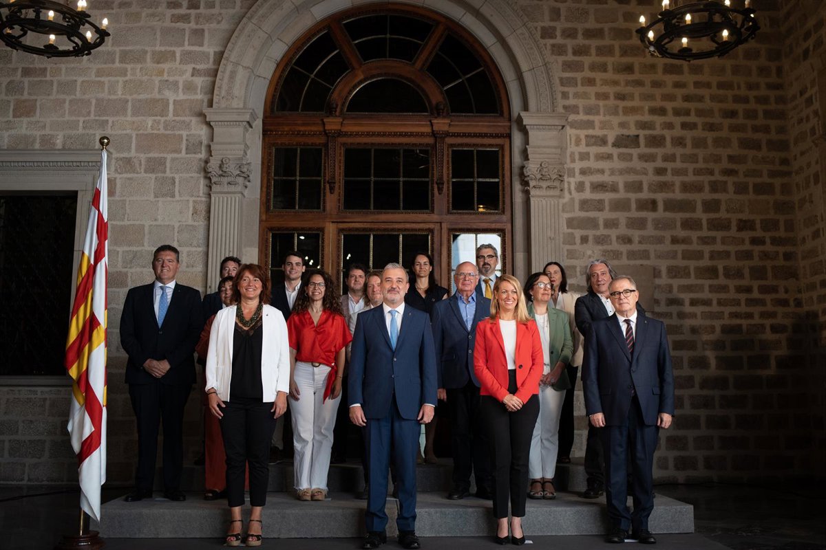 El alcalde de Barcelona, Jaume Collboni, junto a los tenientes de alcalde y concejales que conforman el nuevo gobierno municipal. - DAVID ZORRAKINO - EUROPA PRESS