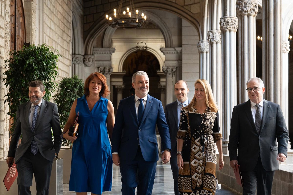 El alcalde de Barcelona, Jaume Collboni, junto a los tenientes de alcalde Albert Batlle, Laia Bonet, Maria Eugnia Gay y Jordi Valls, y el gerente municipal, Albert Dalmau. - David Zorrakino - Europa Press